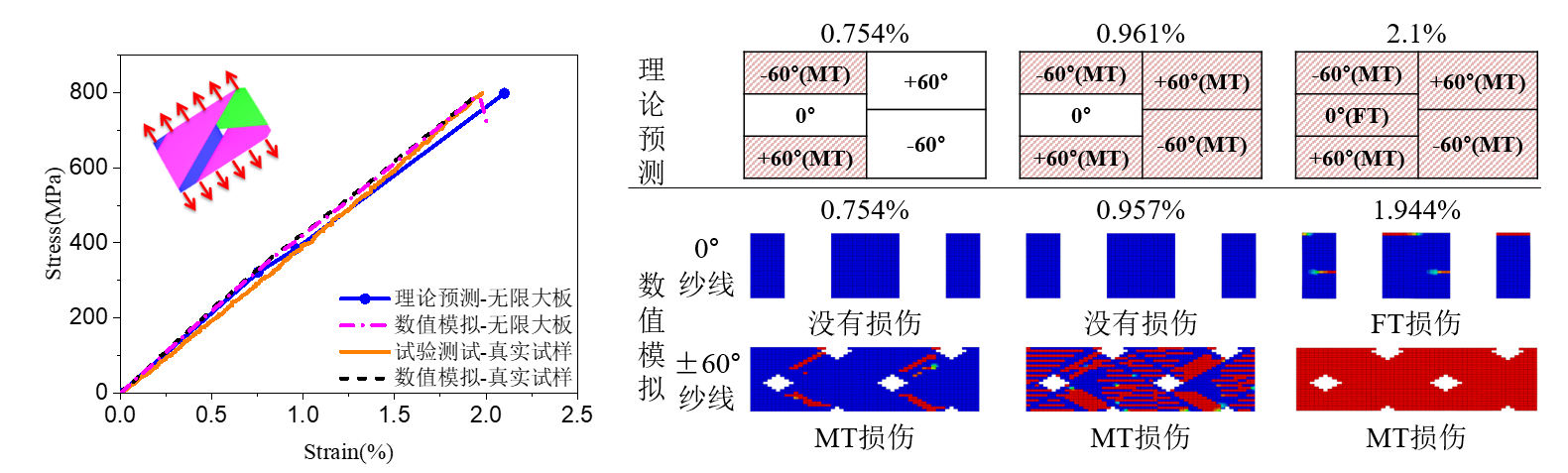 目前,该模型已被成功应用于平纹机织复合材料、斜纹机织复合材料、二维三轴编织复合材料和经向增强的2.5D机织复合材料在多种面内载荷下应力应变响应和强度性能的预测,与试验和数值结果的对比,验证了该理论模型的有效性和准确性。该理论方法为纺织复合材料的性能预估和构型筛选提供了关键的设计工具,也将为我国新一代商用航空发动机复合材料结构的设计提供基础理论和方法支撑。