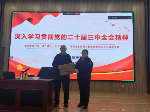 梁三星教授的专题党课由中共二十届三中全会公报主要内容、中共二十届三中全会《决定》的主要内容、贯彻全会精神推动西工大“双一流”建设三部分组成,内容丰富、话语生动,既有政策理论高度、又紧密结合学校发展实际,对于广大师生深入学习贯彻党的二十届三中全会精神和学校第十四次党代会精神具有重要指导意义。