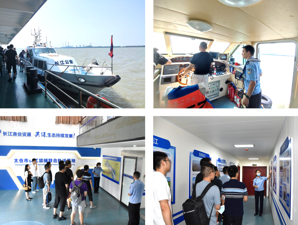 实地调研,掇菁撷华。活动中,全体成员在太仓港共同乘坐公安艇,开启了长江生态保护志愿巡航之旅。大家领略着长江之美,同时也关心着长江的生态文化,通过风力感知,水流测速和水质抽检,了解巡江工作的各项环节。随后,参观了太仓市长江禁捕联合执法基地,现场听取了“长江生态大保护”政策以及禁渔行动相关法规,切身感受到非法捕捞和违规排放给长江生态环境和水质安全带来巨大的隐患,深刻意识到保护长江渔业资源,共谋生态持续发展对维护国民经济稳定的重要性。同时,了解到近些年巡江工作中主要以机械化为主,疫情突袭,炎炎夏日,工作强度相对更高,亟需引入智能联动无人机群侦测技术实现精准定位、快速搜救和救援定投功能,提高巡江工作效率和水平。