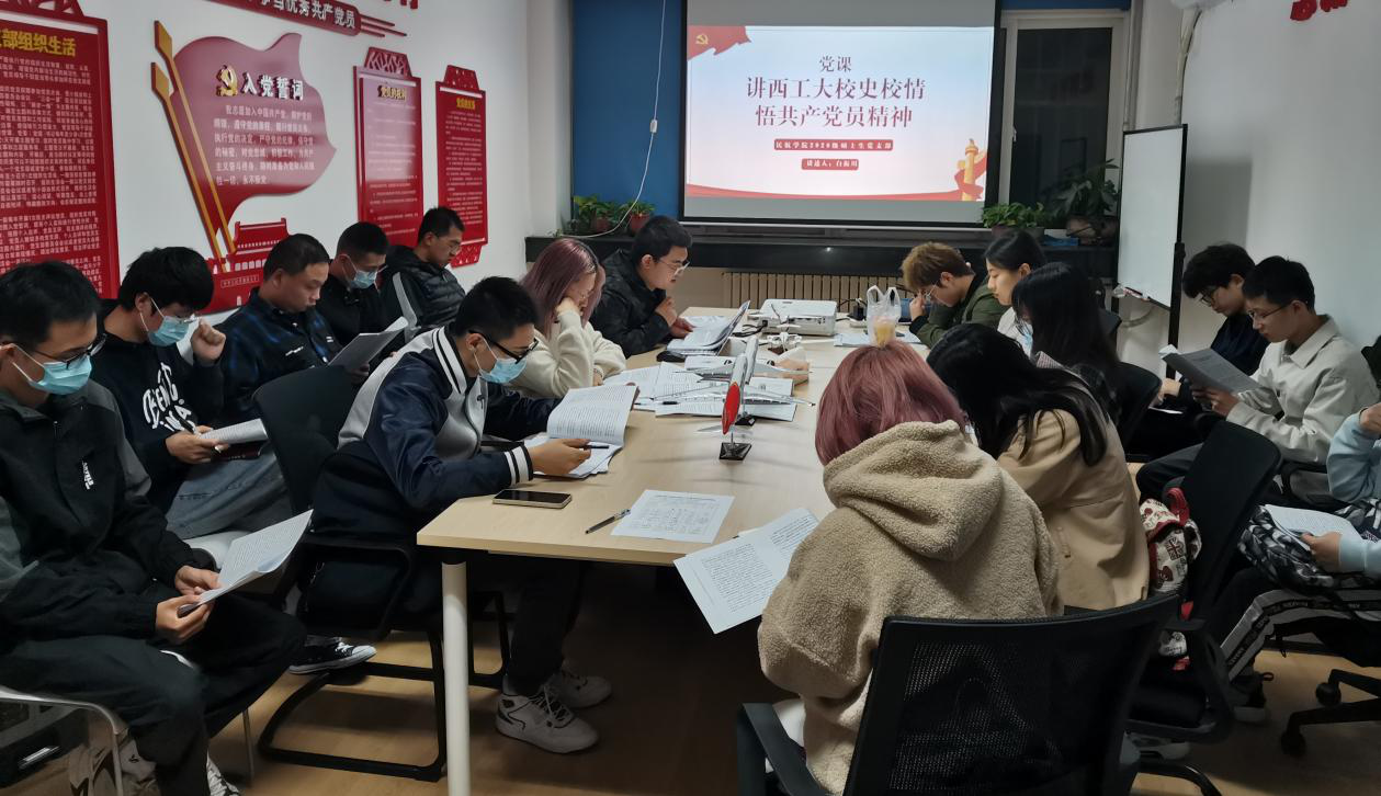 2020级硕士生党支部在毅字楼205开展党课学习,党课题目为“讲西工大校史校情 悟共产党员精神”。第一阶段,由支部书记白振川同志领学,带领全体党员集体学习校长汪劲松同志在2021年暑期学习研讨会暨新学期干部大会上的讲话《立足新发展阶段 贯彻新发展理念 构建新发展格局 加快建设高质量人才培养体系》。紧接着,支部党员集体学习了党内法规《中国共产党普通高等学校基层组织工作条例》《中国共产党组织工作条例》《中国共产党支部工作条例(试行)》等文件,通过学习加深理解和认识,推动文件精神落到实处、见到实效。此次党课学习进一步加强了支部标准化建设,为“三创三力”样板学生党支部培育工作和年底召开专题组织生活会和民主评议党员等工作进一步夯实了思想基础。