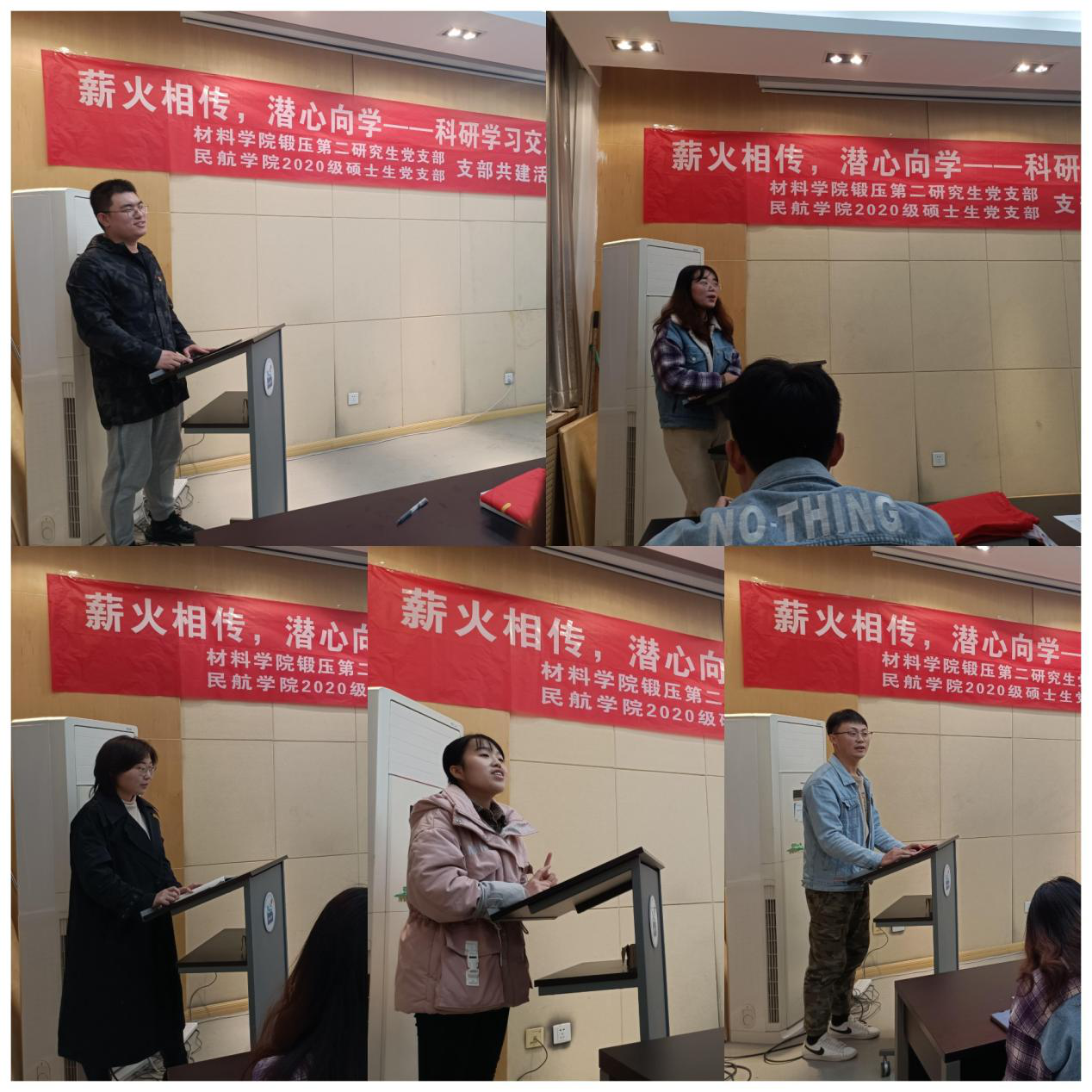 2020级硕士生党支部支委会研究,决定联系材料学院锻压第二研究生党支部进行支部共建,联合开展支部有关工作。11月5日,在公字楼334室,两个党支部联合举办“薪火相传、潜心向学——科研交流研讨会”主题党日活动,为支部党员和支部所在年级广大同学在科研学习生活中面临的实际问题提供解决思路。支部书记白振川、白丹妮两位同志共同主持活动。