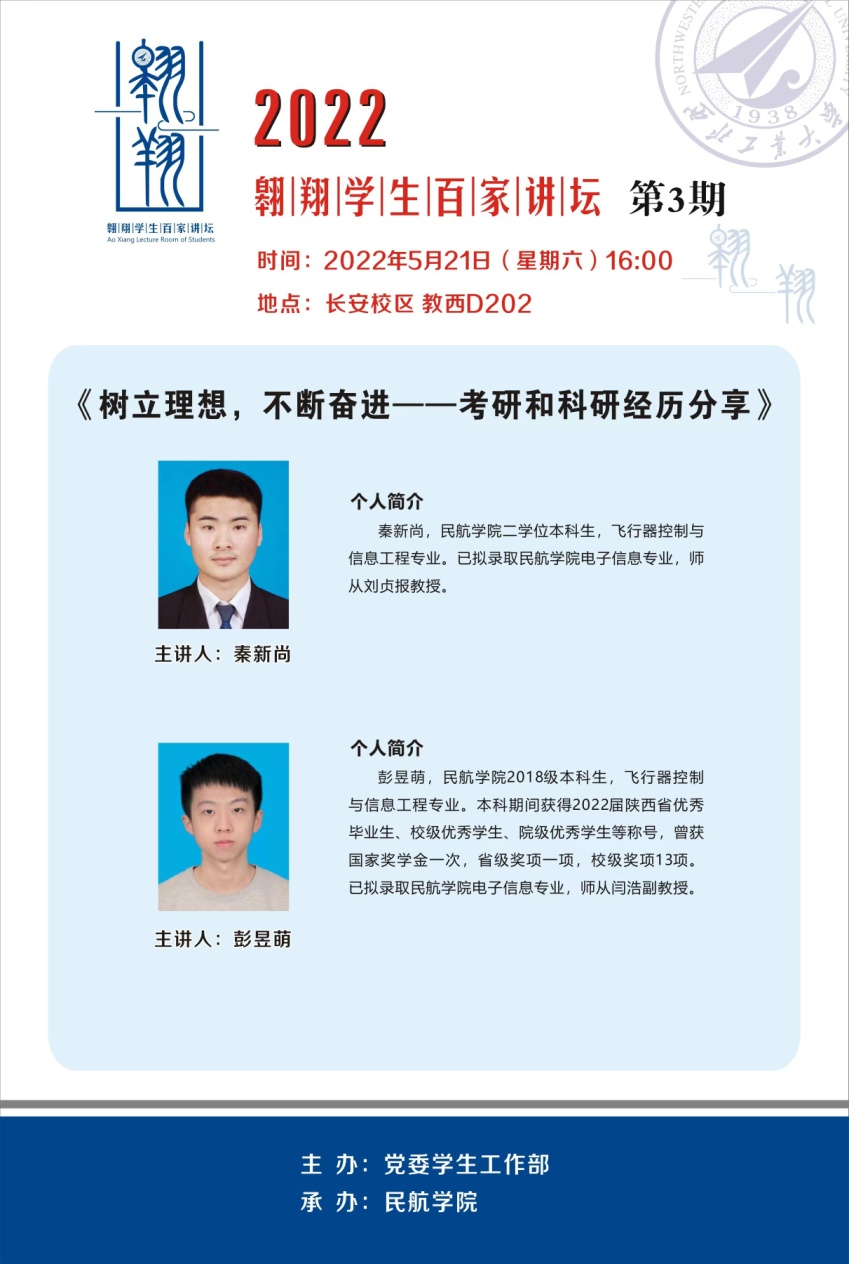 开展翱翔学生百家讲坛活动,邀请2022届本科毕业生代表彭昱萌、秦新尚做考研和科研经验交流分享。活动由辅导员吴宇主持,学院大一至大三年级学生代表参加了活动。