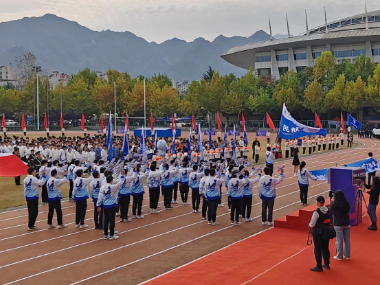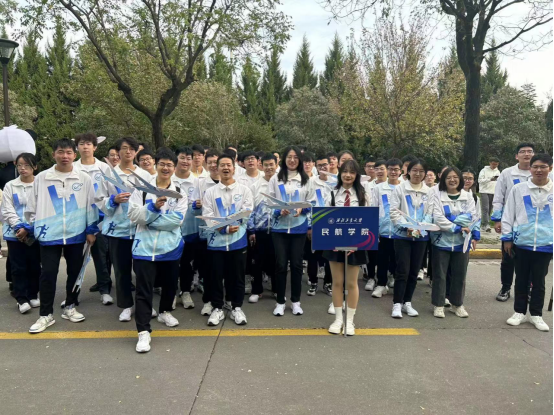 方阵的同学们步伐铿锵有力,昂首挺胸,意气风发。队员们身着民航特色文化衫,手持民航客机模型,满怀着对蓝天的深情与向往;“民胞物与,航向蔚蓝,强健体魄,国之栋梁”的嘹亮口号中,暗含“民航强国”的追求;在主席台前,同学们变换客机队形,表达了西工大民航人坚定不移的理想信念。三万英尺的蔚蓝天空是民航人报效祖国的广阔舞台,红色跑道和绿茵赛场是他们追梦圆梦的青春舞台。