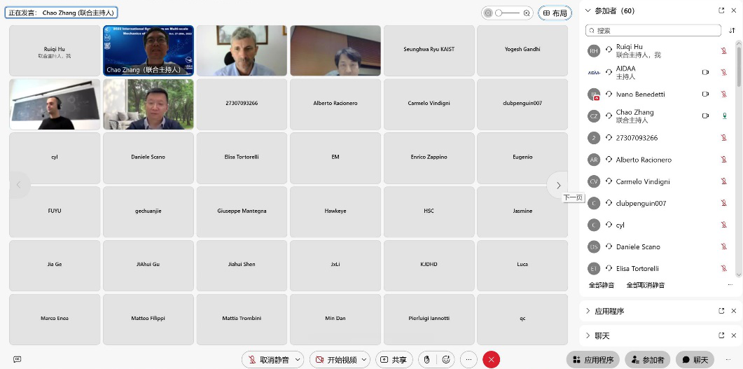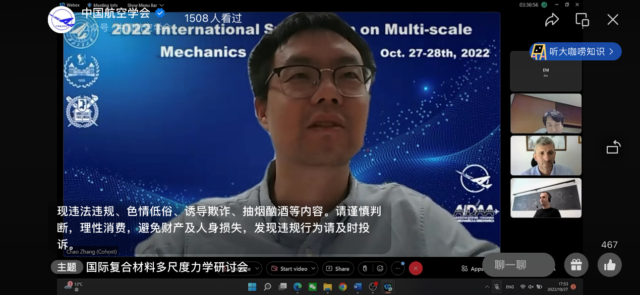 10月27日-28日,由小说色情 联合意大利都灵理工大学、韩国首尔国立大学共同主办的2022复合材料多尺度力学国际学术研讨会线上举行并通过中国航空学会微信视频号同步直播。来自多个国家的70余名专家学者线上参会,其中国外学者30余名;1500余人通过直播平台参会。